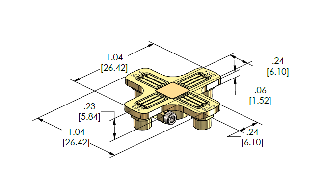 A sample mount module with four high-frequency RF connections on a coax waveguide sample PCB with ground-signal-ground (GSG) bonding pads. The mount leverages the exchange boss connection style for optimized thermal performance and quick exchange between setups. Maximum sample size of 6 mm square. PCB is reusable and replaceable. This mount in non-magnetic.